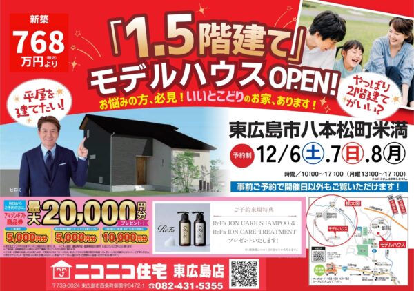 【東広島市八本松町米満】「1.5階建て」モデルハウスOPEN!(12/6~8)