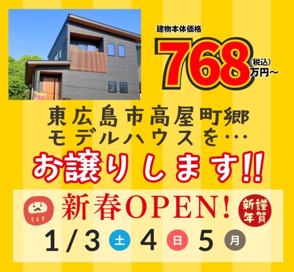 1/3~新春OPEN!【東広島市高屋町郷】モデルハウス、お譲りします!(1/3~5)
