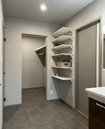 機能的な水回り:洗面脱衣室と直結した収納スペースで、洗濯・乾燥・収納の動線がスムーズに。