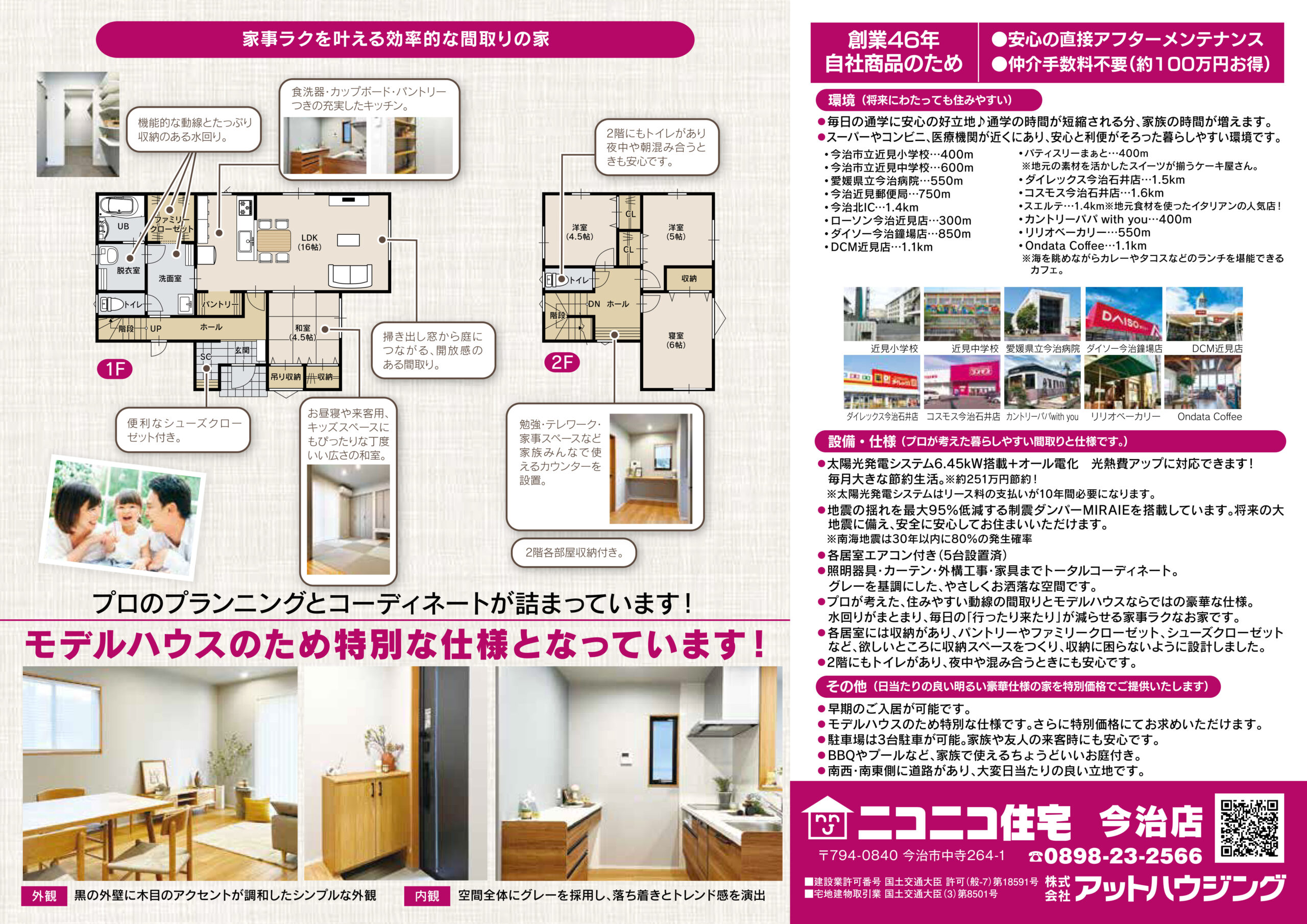 家事ラクを叶える効率的な間取りと、モデルハウスならではの特別仕様。 創業45年の実績を持つ「アットハウジング(ニコニコ住宅 今治店)」が贈る、暮らし心地を追求した一棟です。